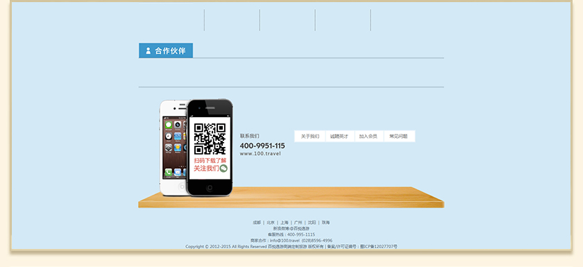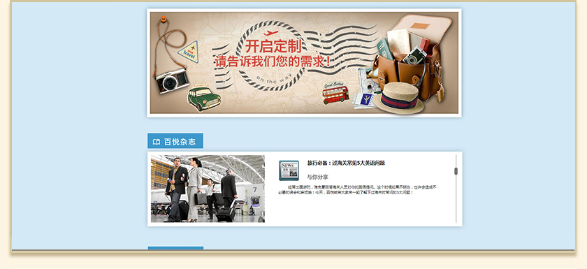 Project Description 百悦逸游于2012年初由二位资深的旅行家创办,是成都传媒集团旗下成都新闻国际旅行社有限公司的高端旅游品牌,总部位于成都高新区天府大道中段美年广场。在百悦逸游成立之前,创始团队亲自到全球三十多个国家实地考察,带着第一手的资讯和执着的信念创立了中国西部第一家真正意义上的私人定制旅行机构。百悦的旅行不是跟团挤大巴,不是十天去十个国家,更不是没完没了的... Official website address 商洛http://www.100.travel I want to share